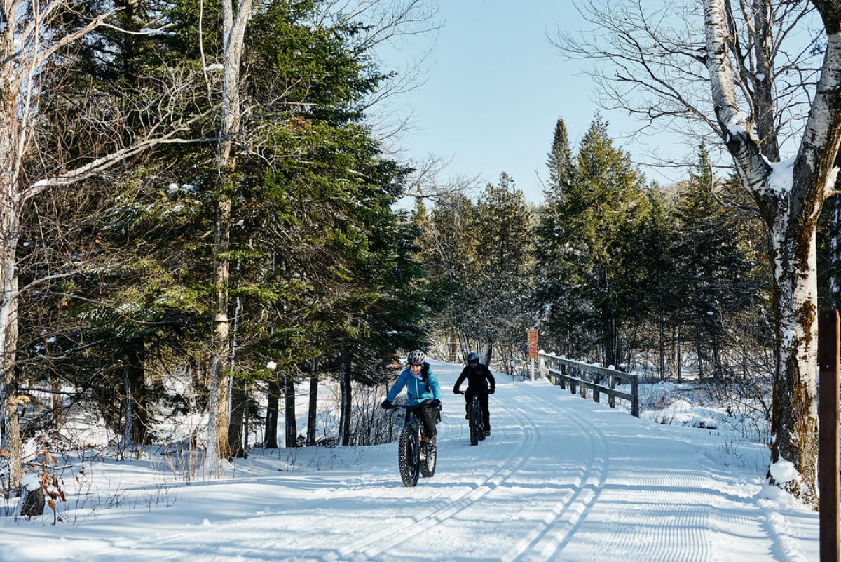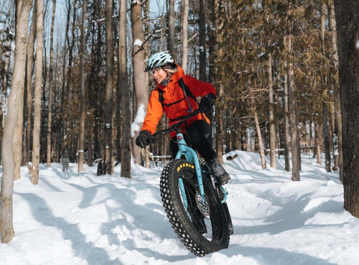 Since few winters, the Parc National de la Yamaska offers 13.5 kilometres of well-groomed trails for fatbikes. Part of the network of trails follows the Choinière Reservoir and is fairly flat. Like the Parc National du Mont-Orford, here, rentals are available and 17-year-olds and younger can borrow one of the two reserved fatbikes for free.