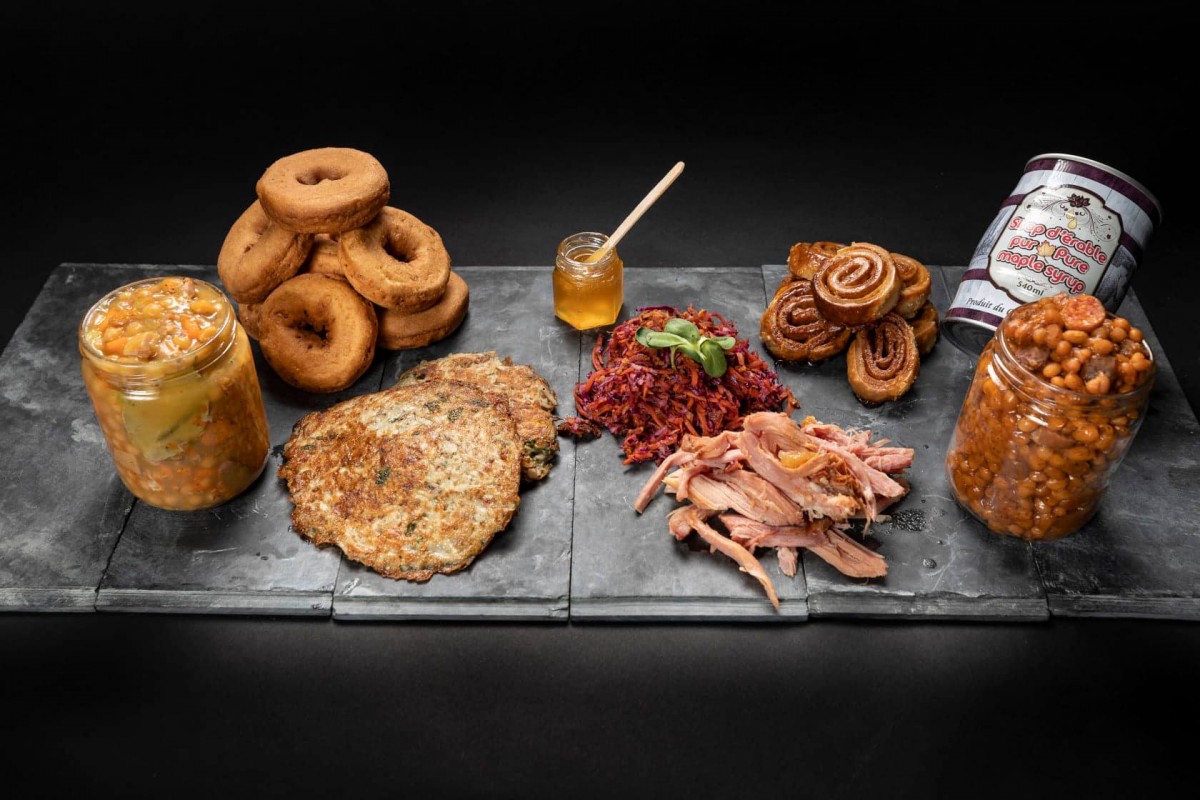 The dining room is small and warm, and welcome at most 28 persons. You will feel almost loike you were with family! Pea soup, pulled maple ham, grilled bacon, assortment of maple desserts, among others, will me offered at the Cabane à sucre et produits La Martine, in Saint-Romain. Meal boxes et many other delicious products are also available to take out.